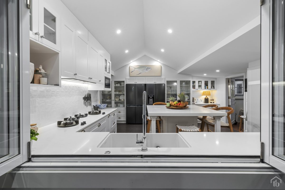 At the heart of the home is the chef’s kitchen, a masterpiece of form and function. Think double German-made Neff ovens, a pit burner gas cooktop engineered in the Netherlands, and an expansive eight-seater dining island under raked ceilings. White stone benchtops and a farmhouse sink carry the Hampton aesthetic, while integrated spice racks, a coffee station, and server windows dial up the practicality. With space for two full fridges, this is a kitchen designed for entertaining as much as everyday living.
