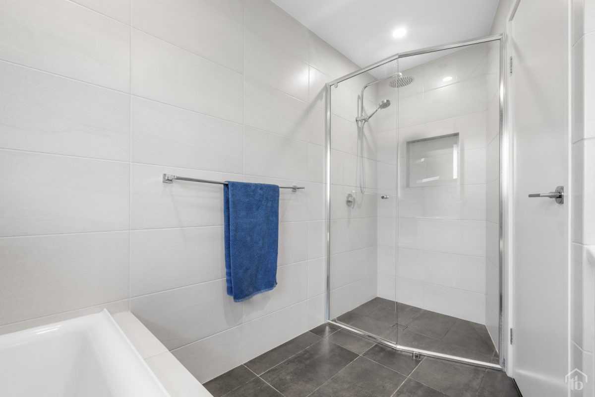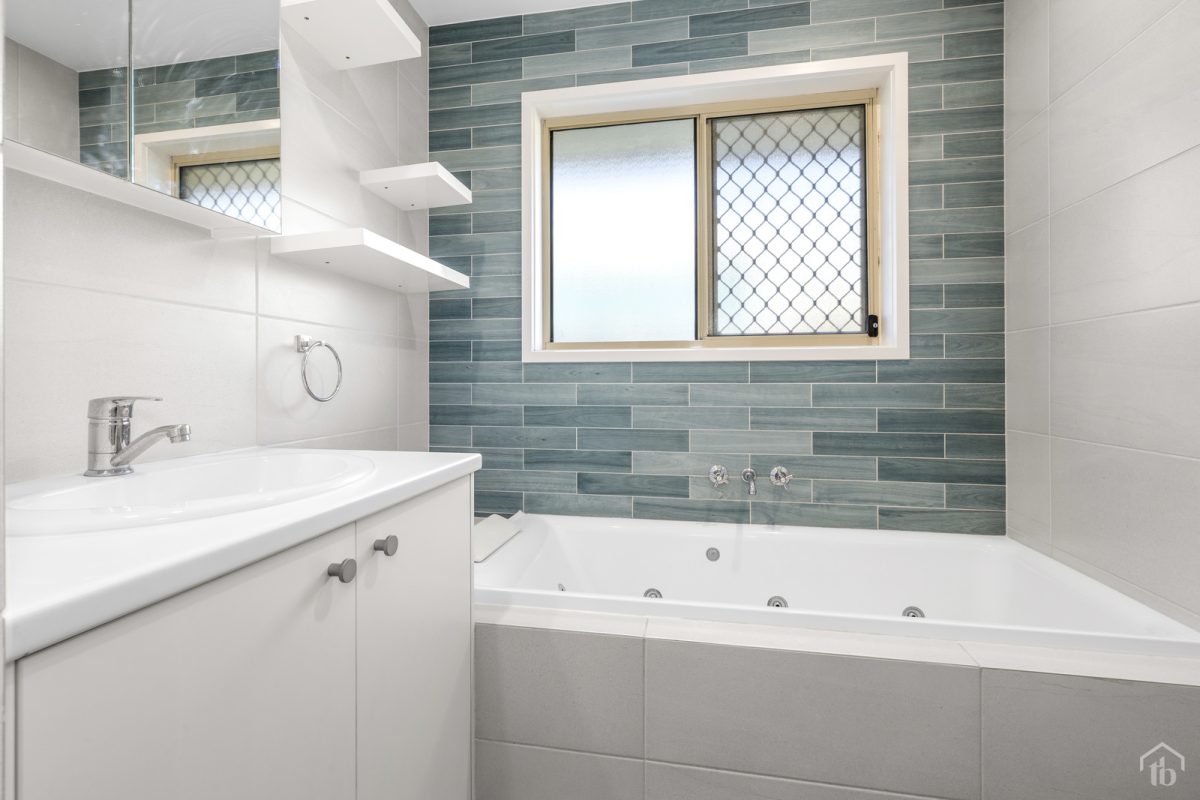 The recently renovated main bathroom features a spa bath, striking feature tiles and clever mirrored storage, while a combined laundry and second bathroom at the rear offers additional convenience for families or guests.