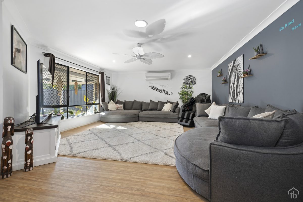 Inside, the home features four spacious bedrooms, all with built-in wardrobes and ceiling fans. Vinyl flooring flows throughout, creating a warm, cohesive feel. The main living area is bright and inviting, with air conditioning for year-round comfort.