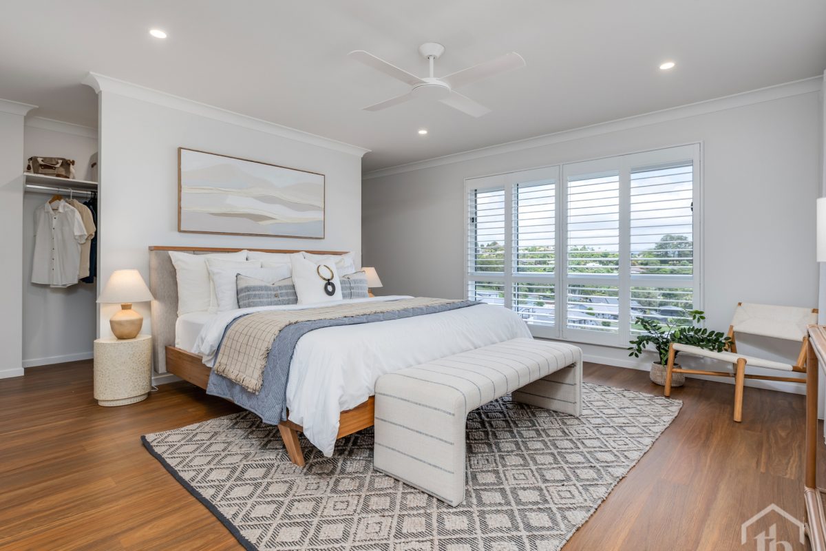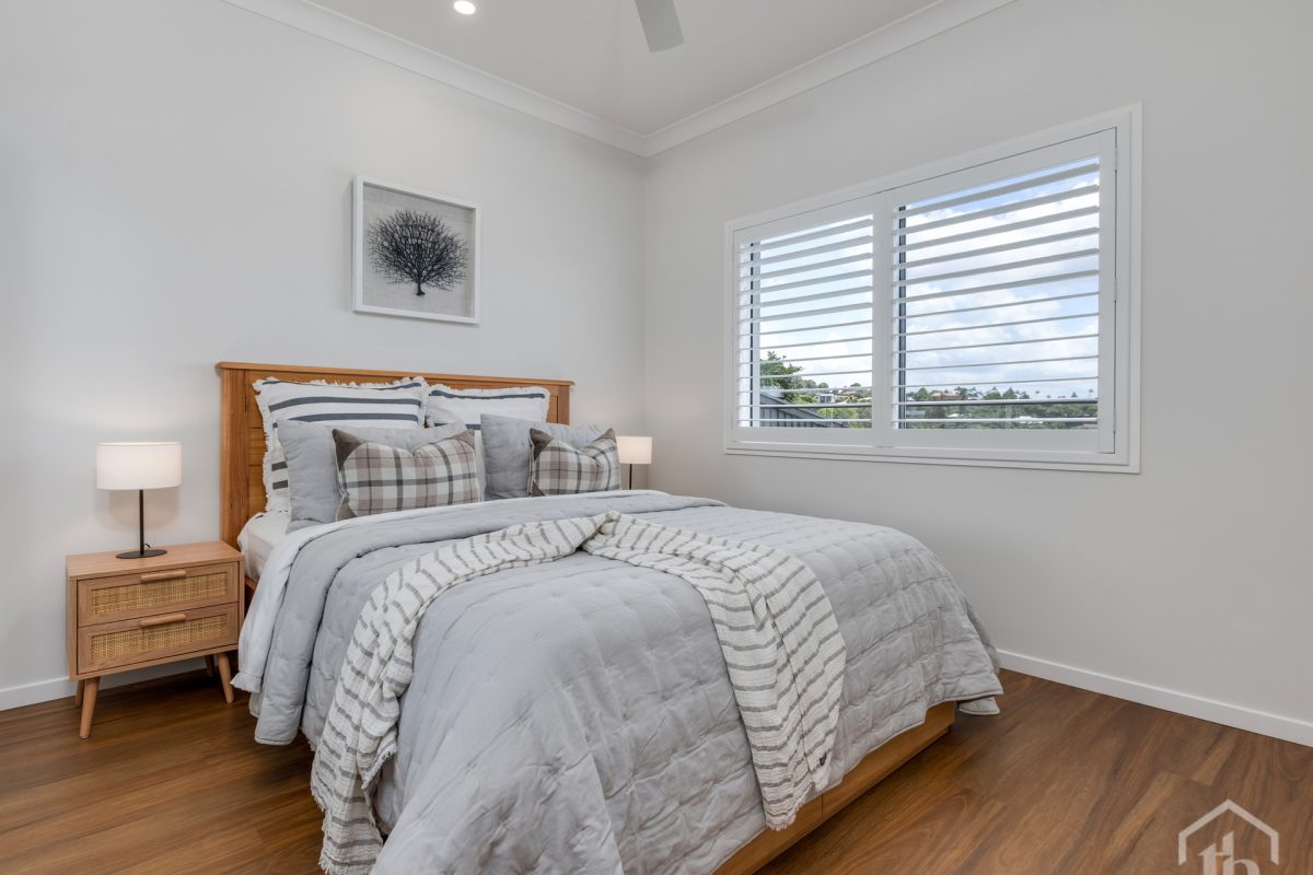 The master suite is privately positioned at the rear of the home, capturing sweeping Broadwater views. It features an oversized walk-in robe, additional built-in storage, and a beautifully appointed ensuite with twin vanities and a walk-in shower. Also on this level is one additional bedroom, a spacious main living zone, and access to a covered balcony-perfect for entertaining while enjoying the outlook and coastal breezes.