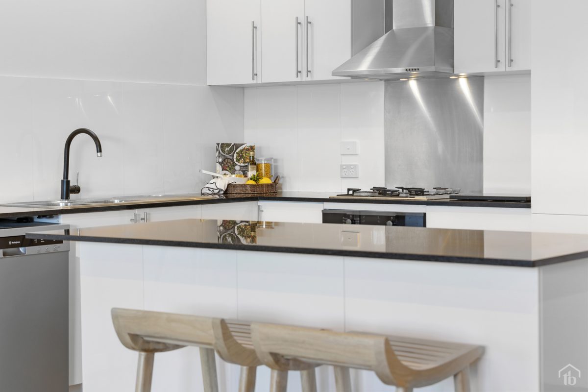 • Caesarstone kitchen with stainless steel appliances and study nook