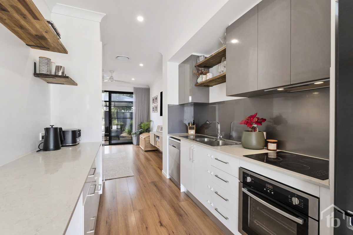 The modern kitchen is equipped with sleek stone benchtops, electric cooking, and a stainless steel dishwasher, making everyday living and entertaining effortless.
