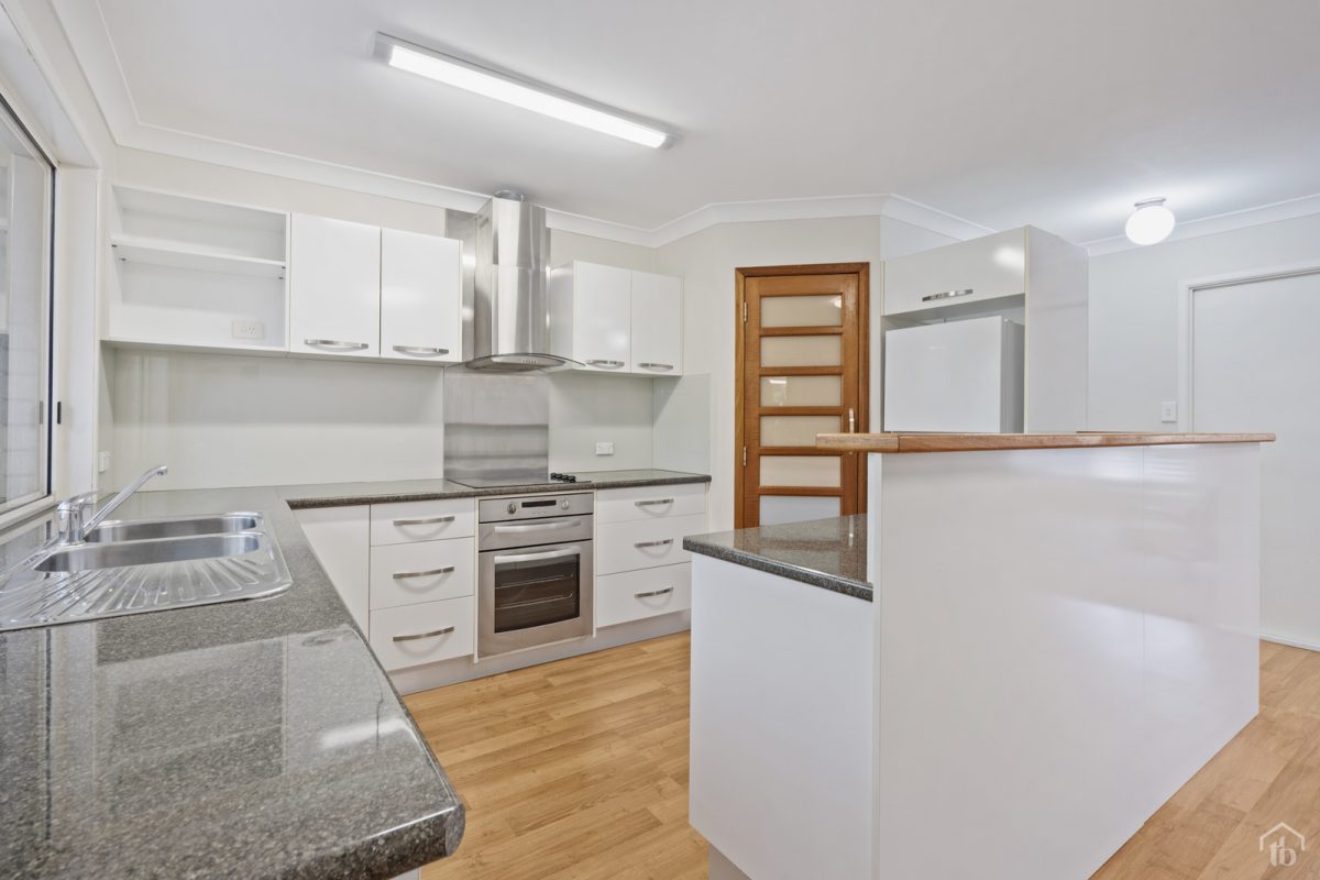 The open-plan living and dining area is light-filled and inviting, enhanced by plantation shutters, ceiling fans, and soft carpeted living and bedroom spaces. The updated kitchen is both practical and stylish, featuring a walk-in pantry, white dishwasher, and ample storage, making everyday living easy.