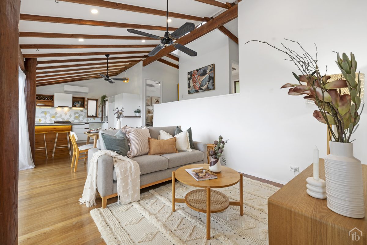 As you enter, you’re greeted by a light-filled open-plan living space, where striking exposed timber beams stretch across the ceiling, adding warmth and architectural appeal. Hardwood timber floors flow underfoot, enhancing the home’s natural aesthetic and creating a seamless connection between the living, dining, and kitchen zones.