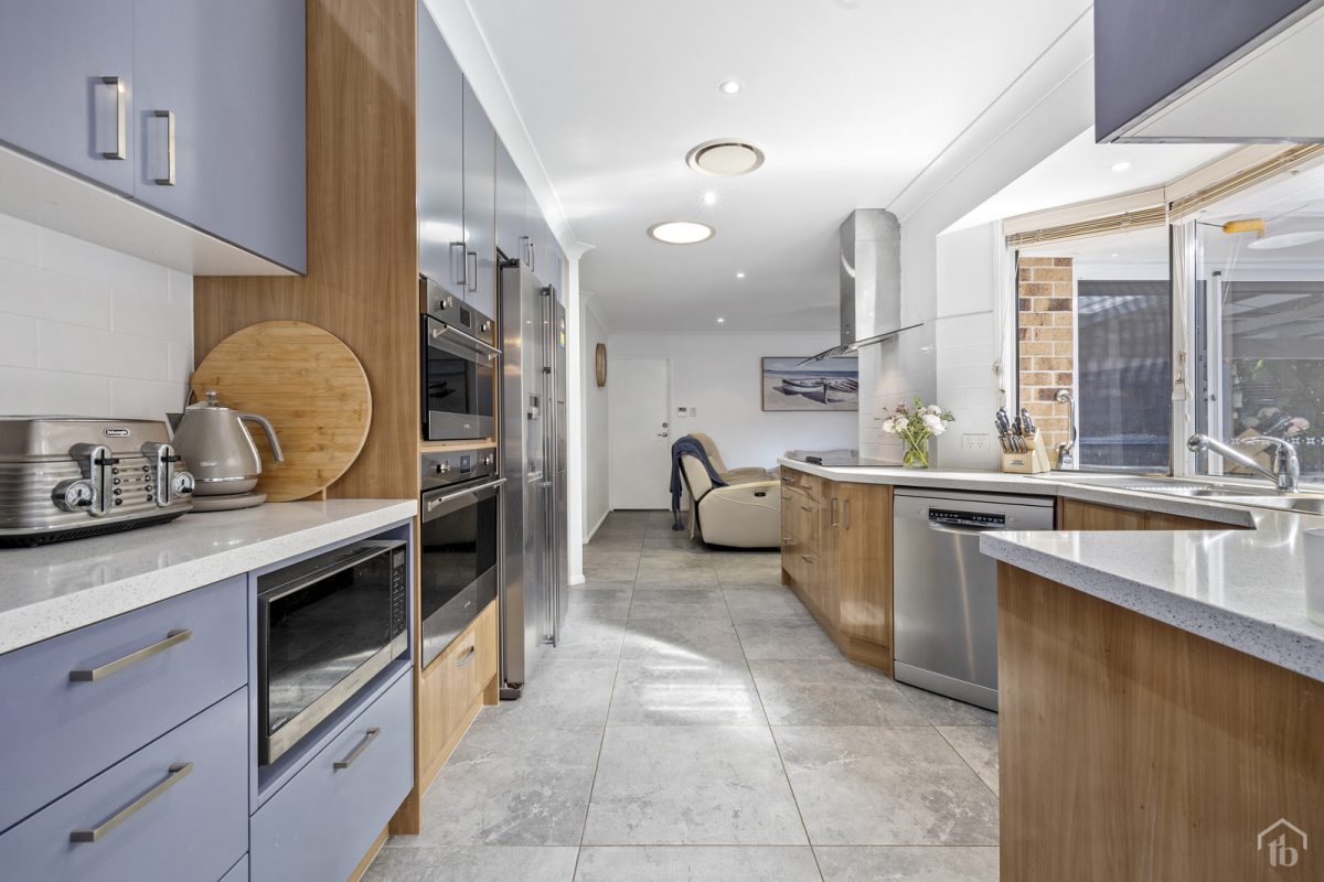 The home’s low-set brick façade is framed by manicured gardens and features timeless plantation shutters, giving it a warm and inviting street appeal. Inside, a thoughtful floorplan separates two internal living zones, offering flexibility for both lively gatherings and quiet retreats. The stylish galley-style kitchen has been tastefully renovated with sleek cabinetry, stone benchtops, and premium stainless-steel appliances – including an electric cooktop, Smeg oven, and dishwasher – making it a true centrepiece for family life.
