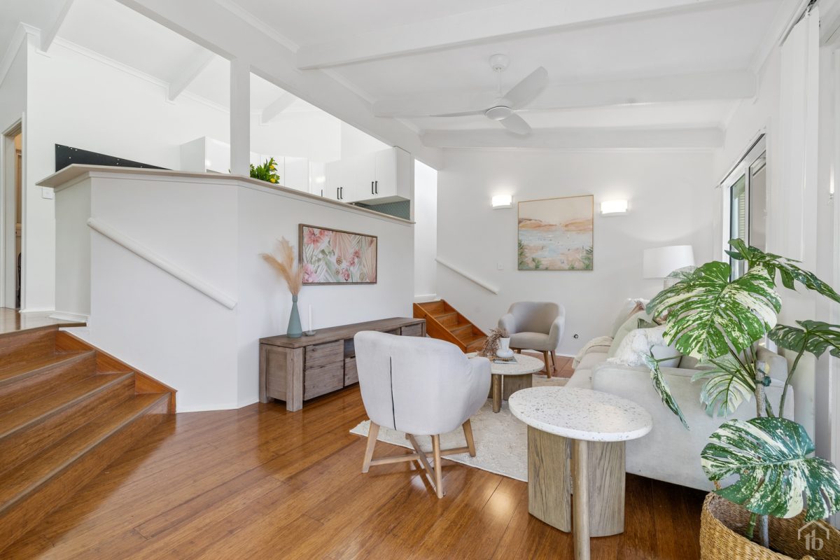 • Upper level with three bedrooms featuring built-in robes and fans.