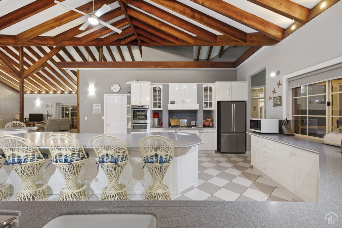 The kitchen is well-equipped with Corian benchtops, stainless steel double oven, gas cooktop, dishwasher, walk-in-pantry and three sinks-making it as practical as it is stylish.