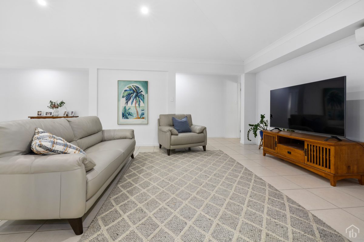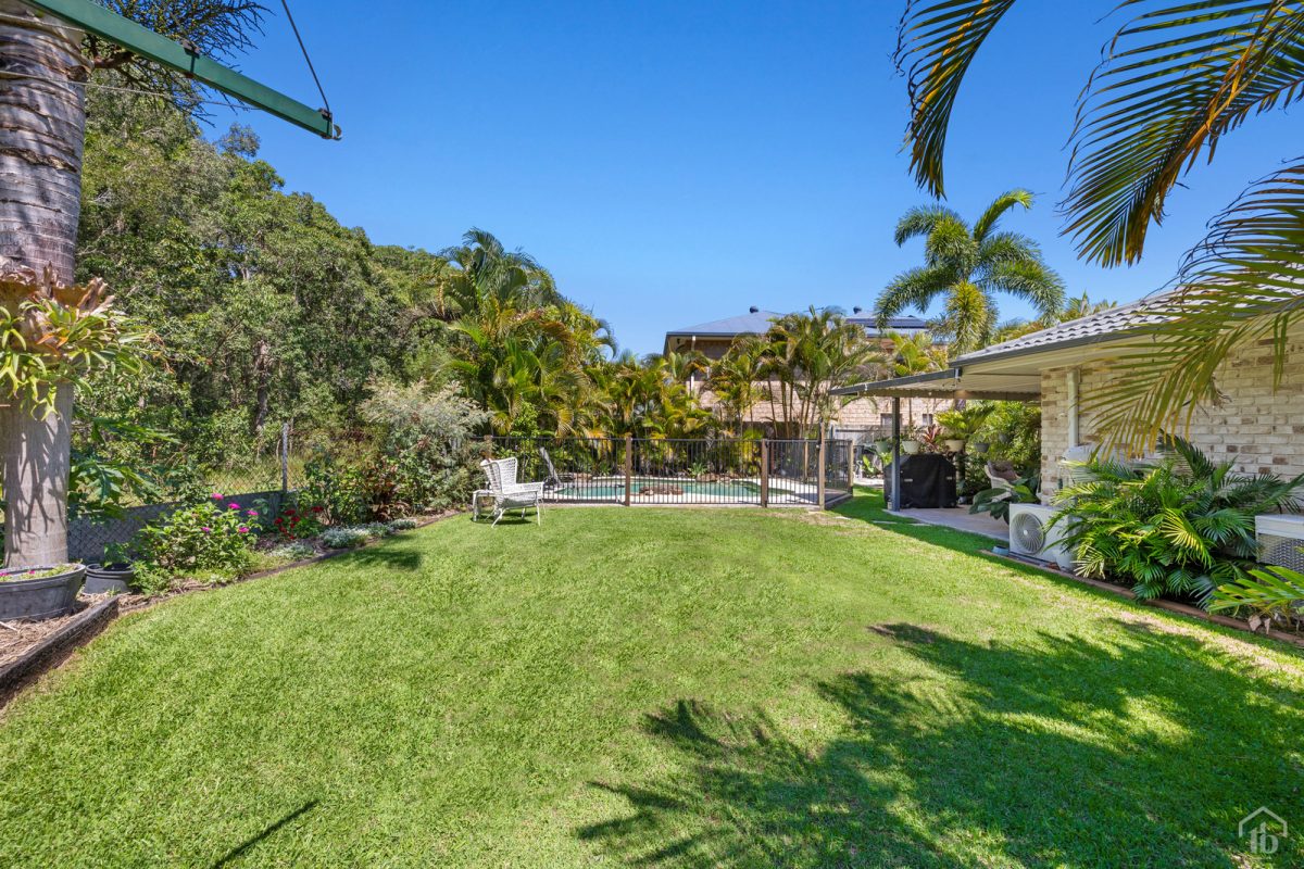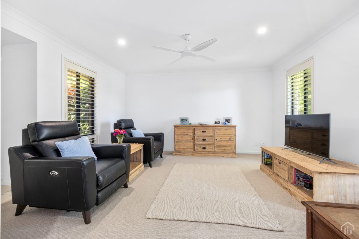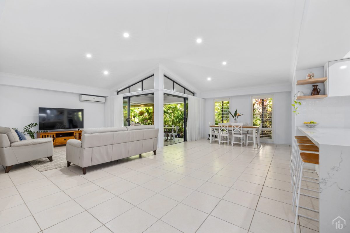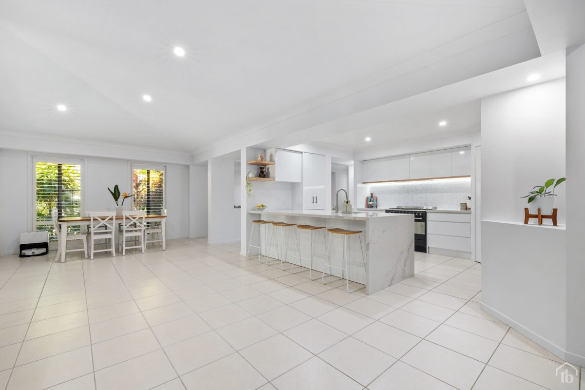 Surrounded by manicured gardens and lush palms, the home backs onto a peaceful council reserve, providing both privacy and a serene natural outlook. Designed with families in mind, the thoughtful floor plan features multiple living areas that cater to all ages. Tiled flooring throughout the living spaces ensures low-maintenance living, while plantation shutters and raked ceiling with a peak of 3.1m elevate the home’s light-filled, coastal aesthetic.