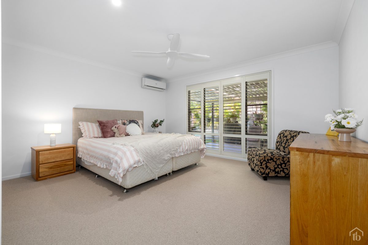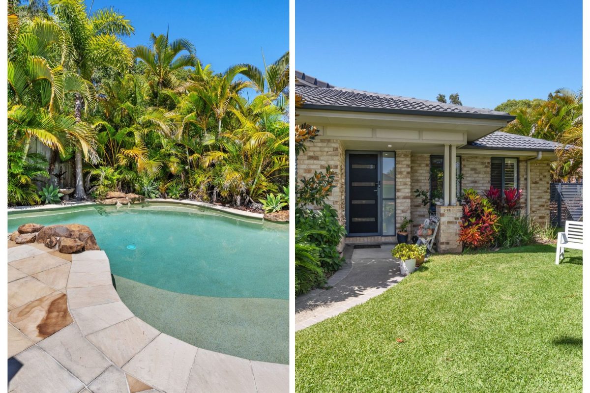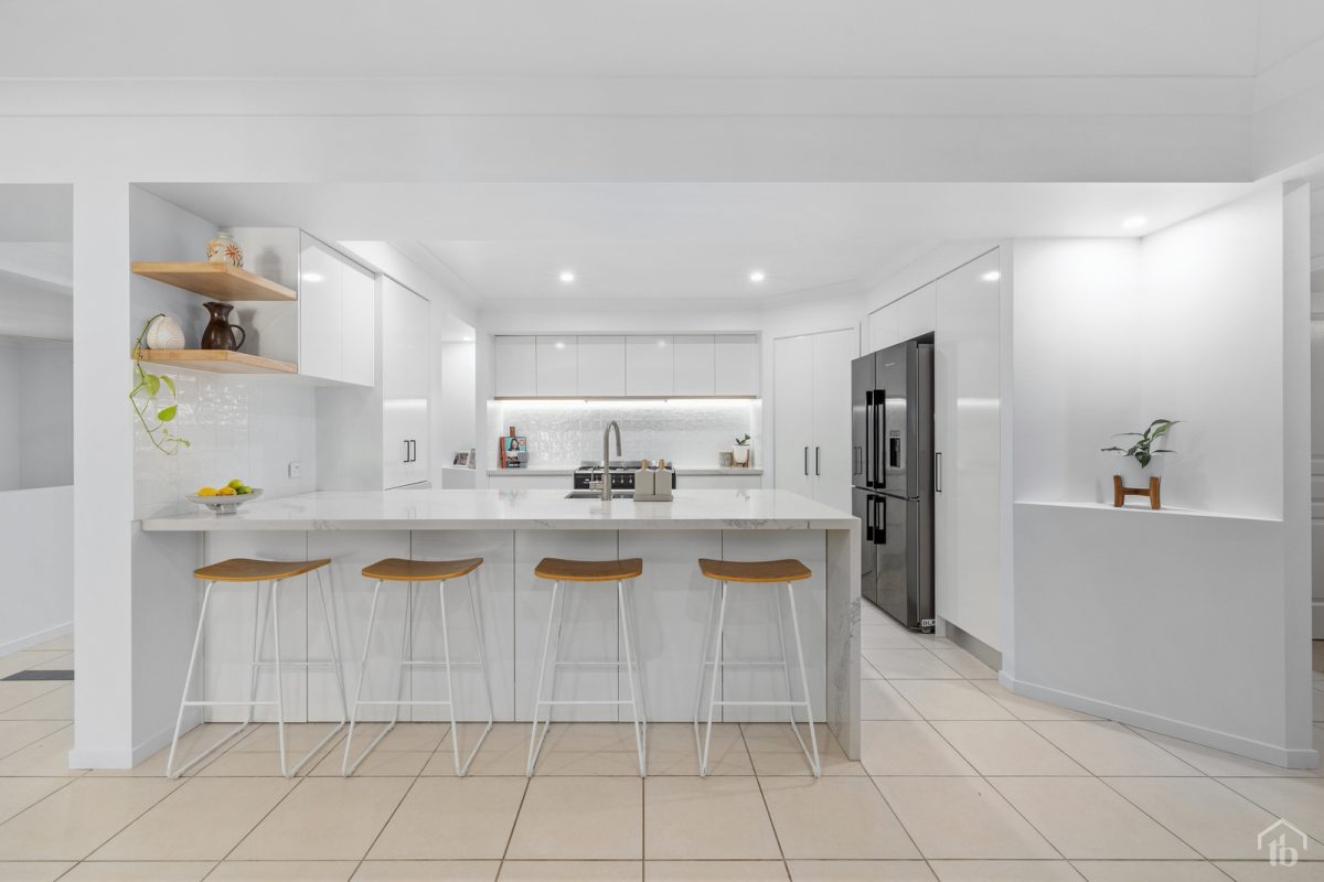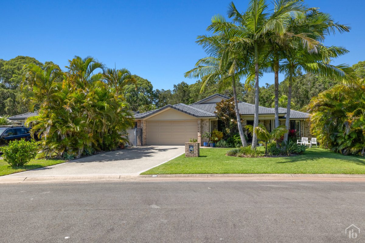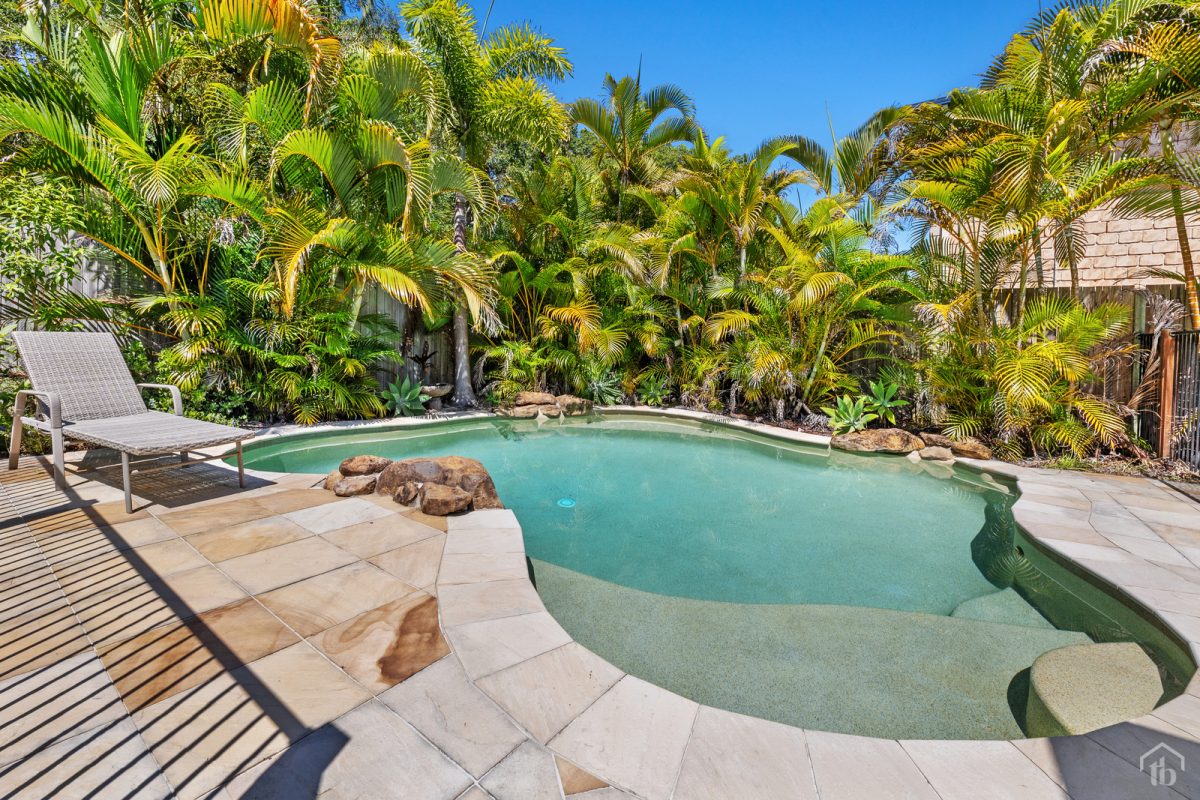 Surrounded by manicured gardens and lush palms, the home backs onto a peaceful council reserve, providing both privacy and a serene natural outlook. Designed with families in mind, the thoughtful floor plan features multiple living areas that cater to all ages. Tiled flooring throughout the living spaces ensures low-maintenance living, while plantation shutters and raked ceiling with a peak of 3.1m elevate the home’s light-filled, coastal aesthetic.