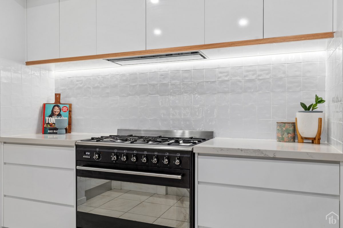 • Designer kitchen featuring a sleek waterfall stone bench, 90cm Smeg gas cooker, double sink, and ample storage