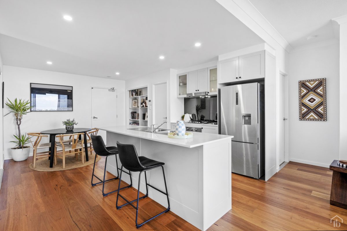 The gourmet kitchen is a chef’s delight, with sleek stone benchtops, quality appliances, and ample storage. The master suite is a private retreat with walk-in robe, ensuite, and direct balcony access. The second bedroom includes a built-in robe and sits adjacent to the main bathroom and integrated laundry.