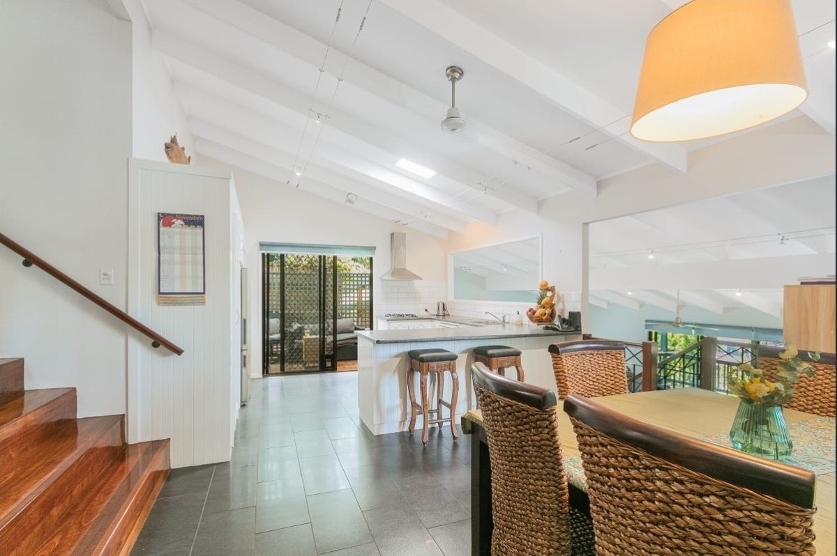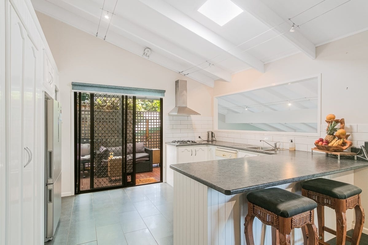Just beyond the living area, the kitchen is equipped with a gas cooktop and opens out to its own private rear deck – a quiet spot for morning coffee or afternoon unwinding. Beside the kitchen, the dining area offers a cosy, light-filled setting perfect for everyday meals or entertaining guests.