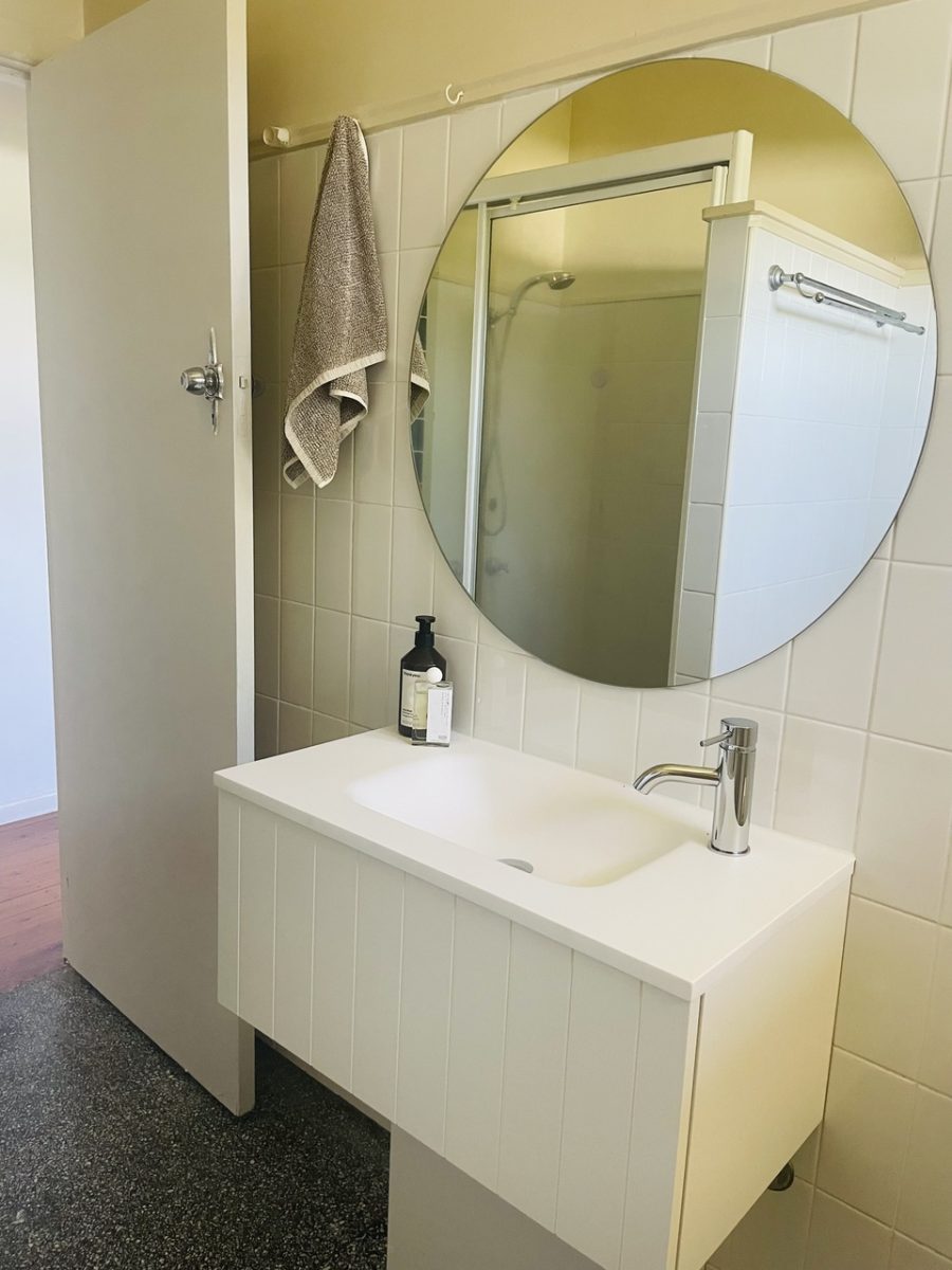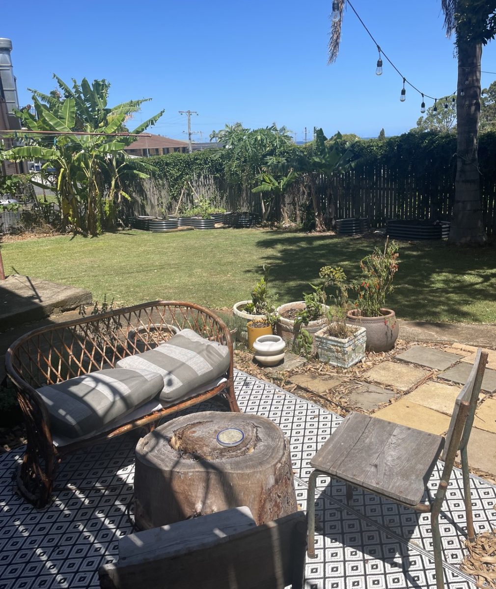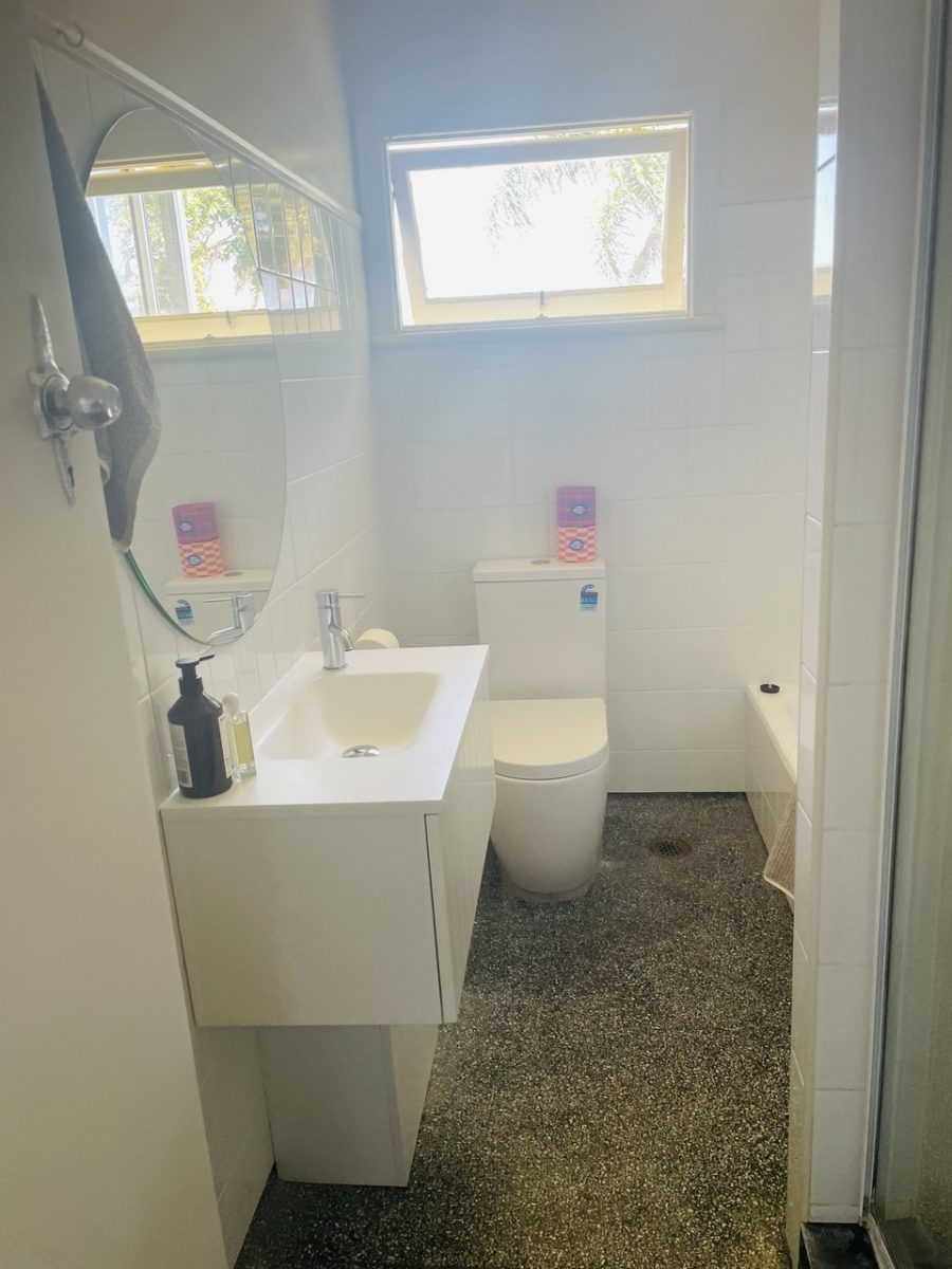 There is a central bathroom upstairs plus an additional toilet downstairs for convenient access from the backyard, a fully furnished rental with ocean views, ready for occupancy.