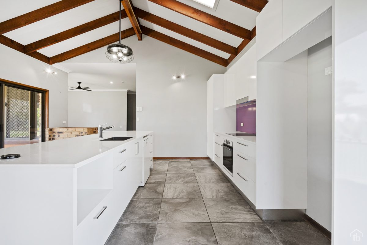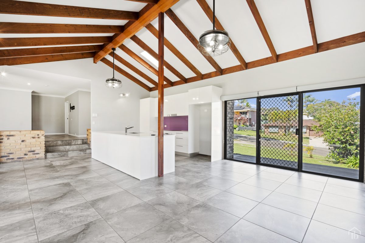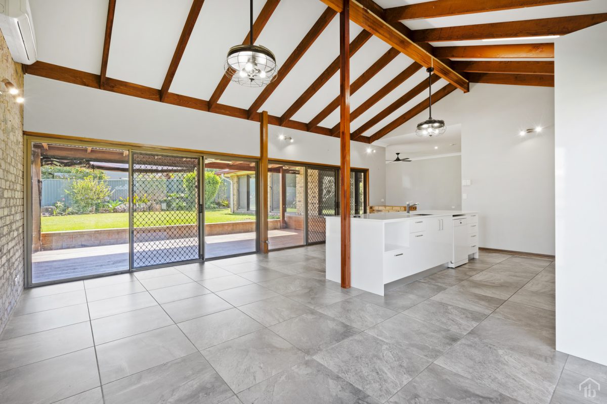 Step inside to discover soaring high raked ceilings and a light-filled lounge room that welcomes you at the entrance. A few steps down and you’ll find a trendy, fully renovated kitchen featuring sleek cabinetry.